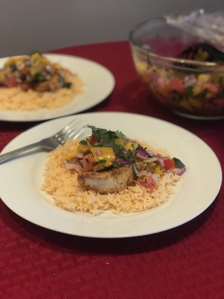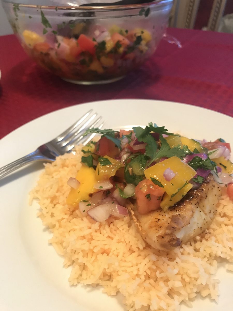 Make a bed of rice on the plate and place a cod fillet on top. Then cover the fillet and the rice with mango salsa and serve it! Believe me, your dinner guests won’t be disappointed!