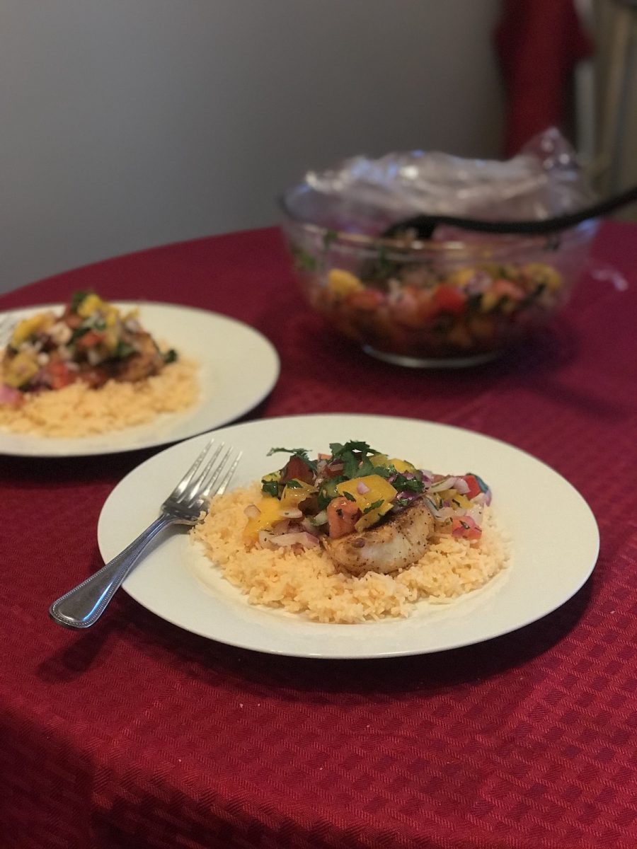 The mango salsa is the centerpiece of this meal. It’s what will tie the flavors of the cod and yellow rice together. Salsa is always great to make because you can add or omit ingredients that you like. You can make it special to you. I used the basics in mine.